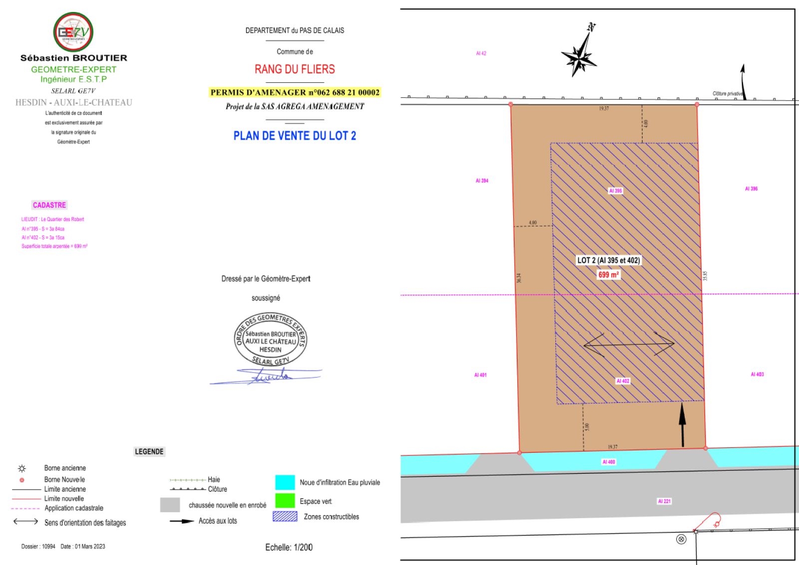 D'une surface de 699m² avec une surface de plancher constructible de 200m², il dispose en limite de propriété des branchements à l'eau, l'électricité, la fibre optique et le tout à l'égout.